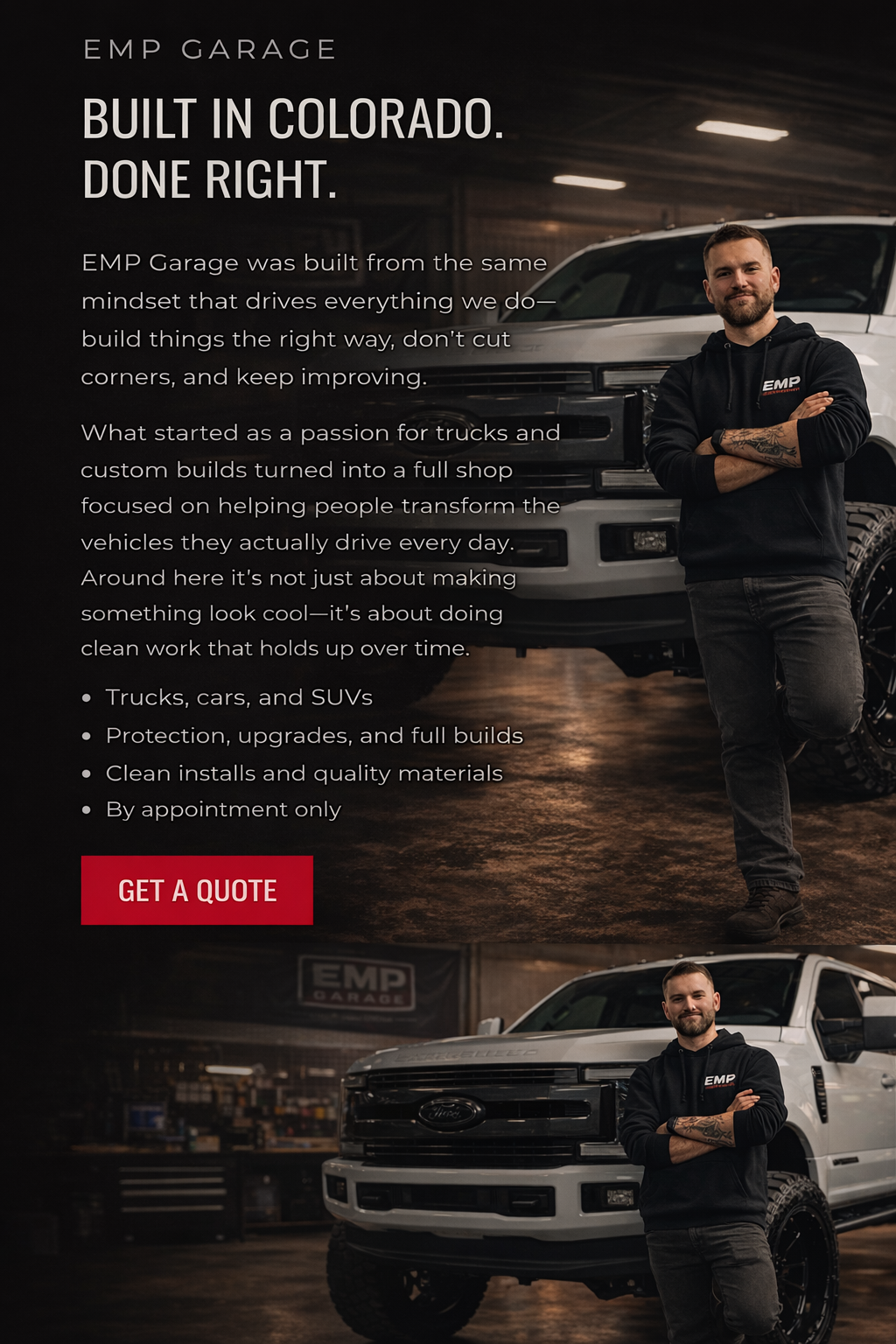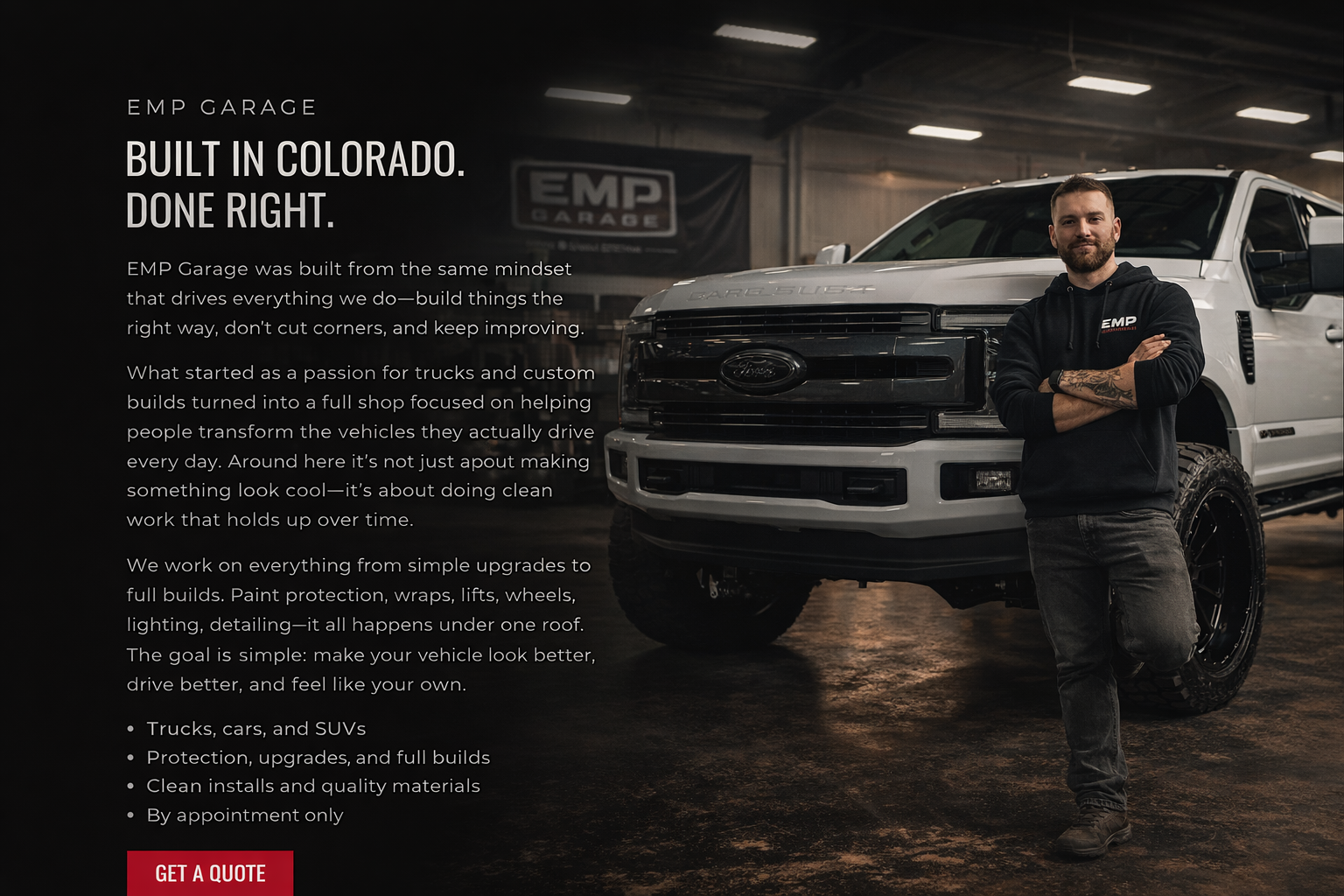 Wraps, tint, lifts, wheels, detailing, and full custom work โ all done in-house in Brighton, Colorado.